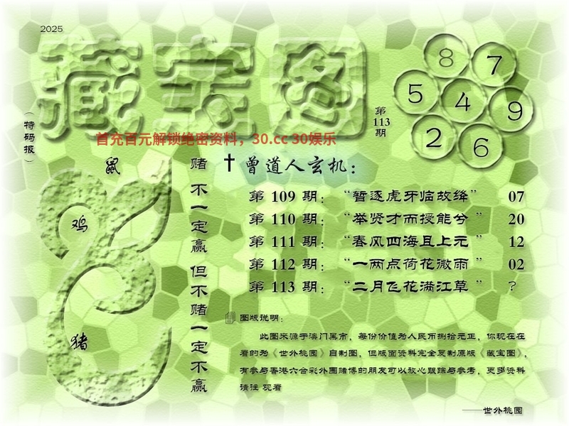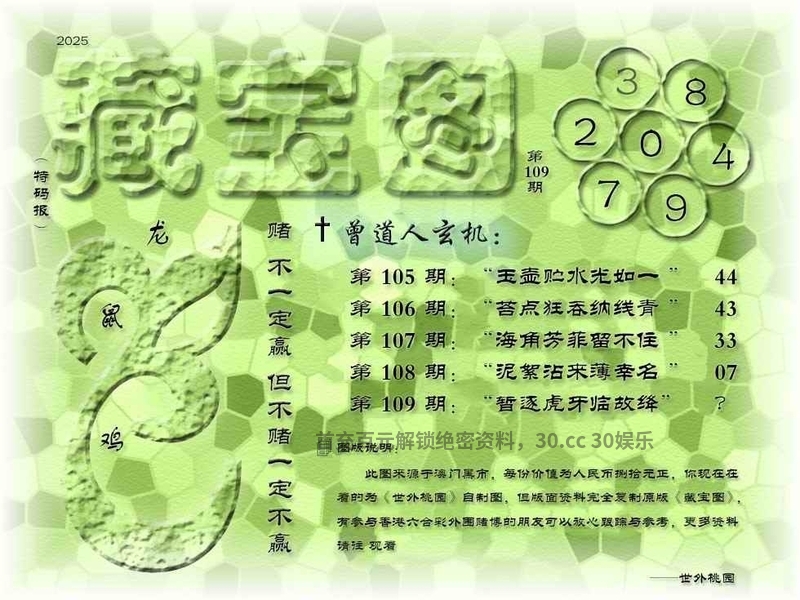 114期藏宝图:【更新中】 浅解:更新中 综合解肖:更新中 |